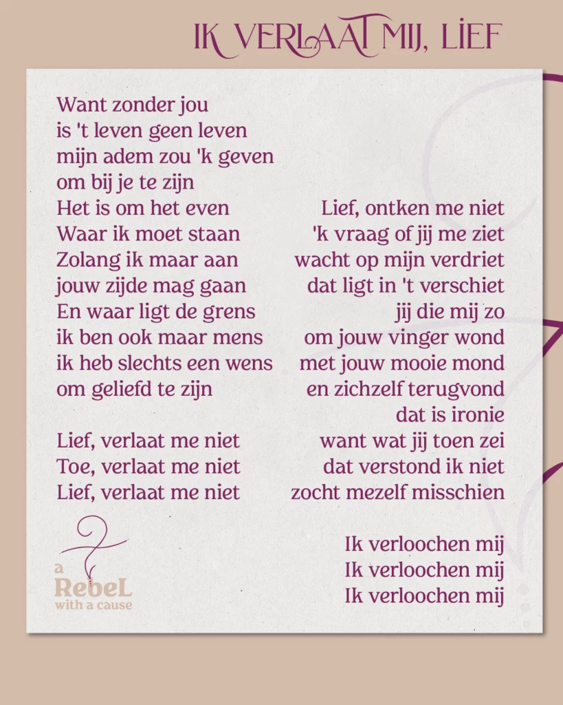 In deze Nederlandse vertaling van ‘Ne me quitte pas’ vertel ik het verhaal dat onder het machteloze ‘Verlaat mij niet’ schuilgaat. Het trauma dat trekt en verstoort. Het bang zijn om verlaten te worden, maar ondertussen zelf al vertrokken zijn. Of anders er wel onbewust alles aan doen dat de ander vertrekt of al vertrokken is. En jij maar denken dat je er alles aan deed of hebt gedaan. Dat het je overkomt.