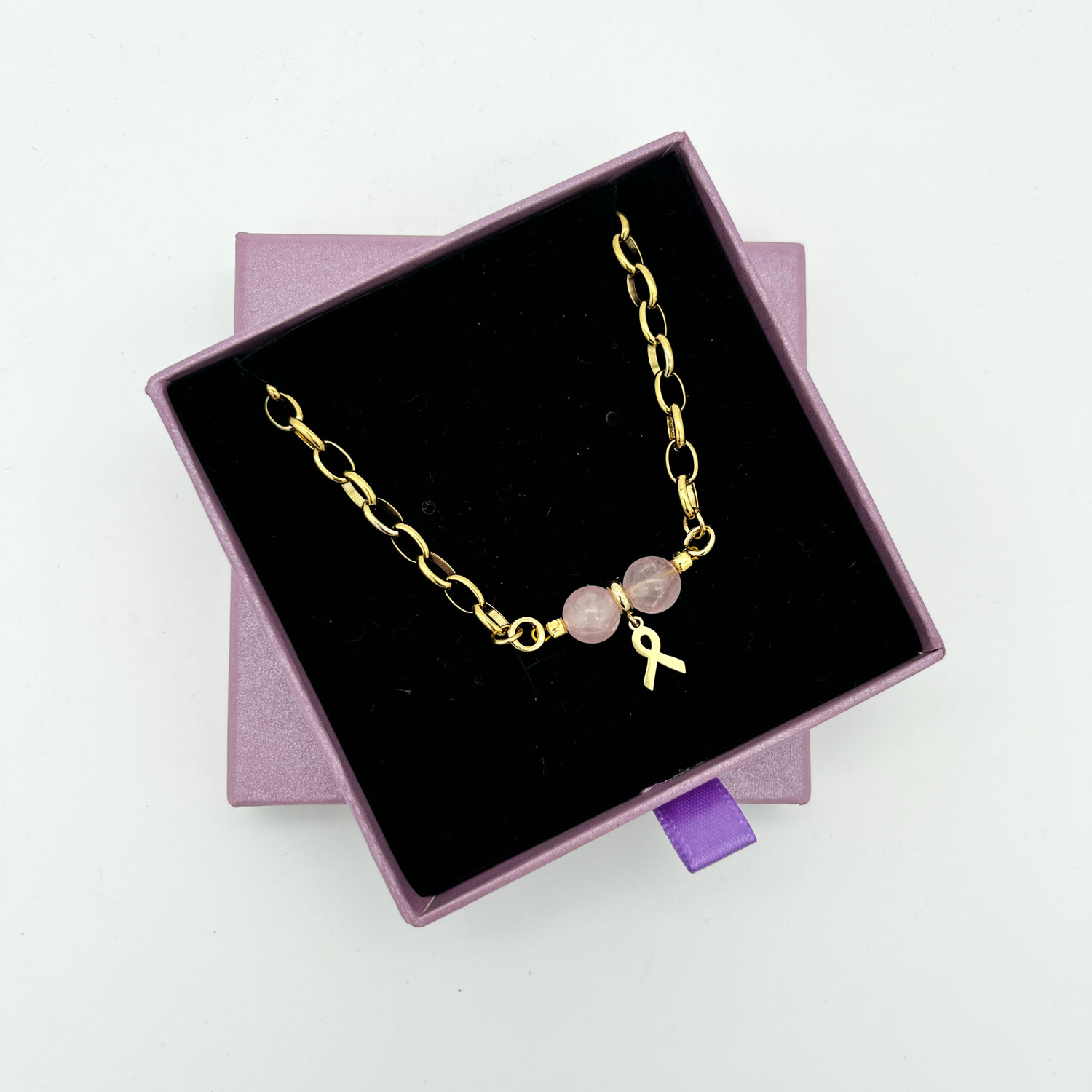Met deze 18K vergulde roestvrijstalen armband kun je met iemand steunen die de behandeling tegen borstkanker door moet. De bedel is een ribbon van 18K verguld roestvrijstaal. Daarnaast zitten 2 rozenkwarts stenen van 8 mm.