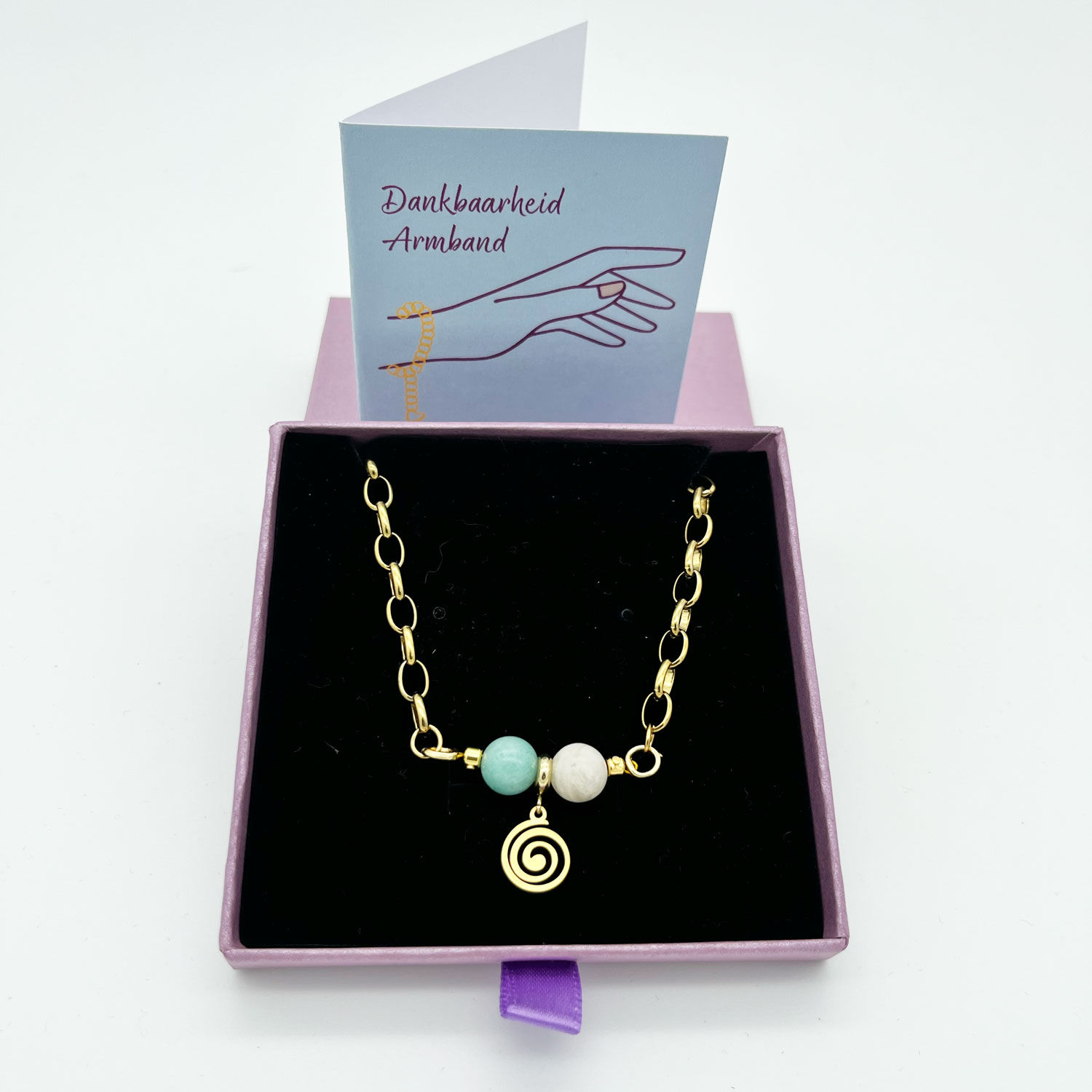 De armband ‘Dankbaarheid’ is een armband van premium gold plated roestvrij staal met Amazoniet stenen en een spiraal bedel. De premium gold plating is duurzaam en blijft lang mooi. Van de edelsteen Amazoniet wordt gezegd: