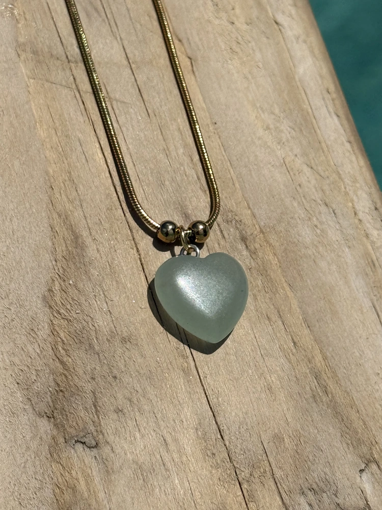 De hanger is Aventurijn in de vorm van een hart. De ketting is een vergulde schakel van roestvrij staal (hypoallergeen, dus vrij van nikkel en lood).
